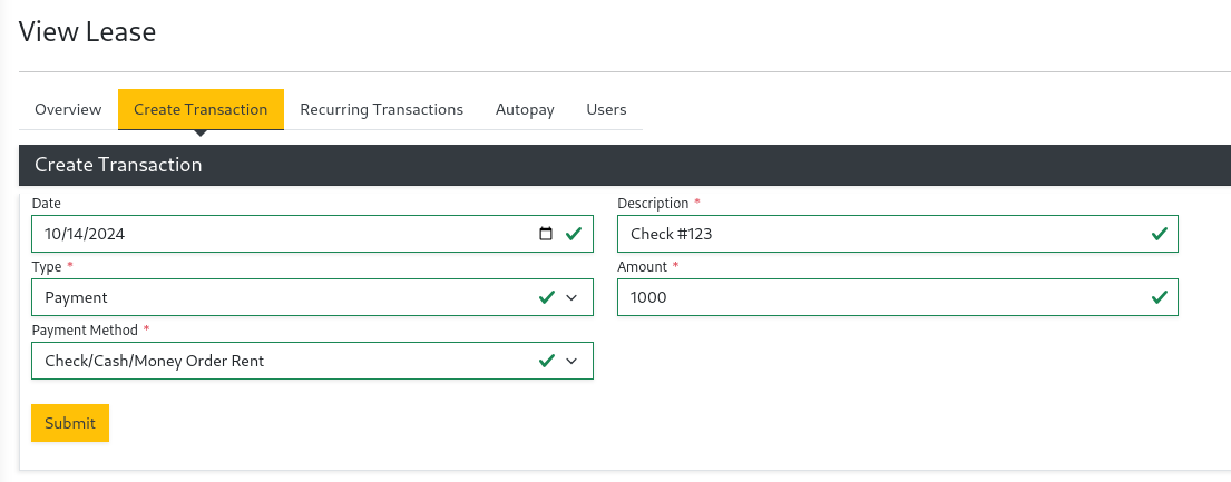 Create Transactionwhen viewing the lease