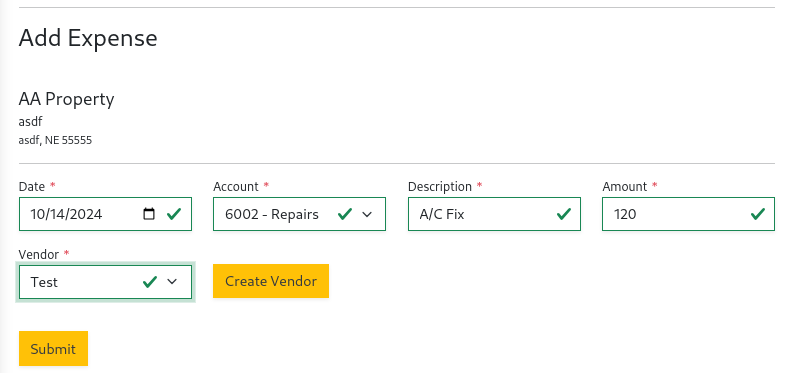 Expensesunder theAccountingmenu. - Enter the date, expense account, description, amount, and vendor. If this is a new vendor, select